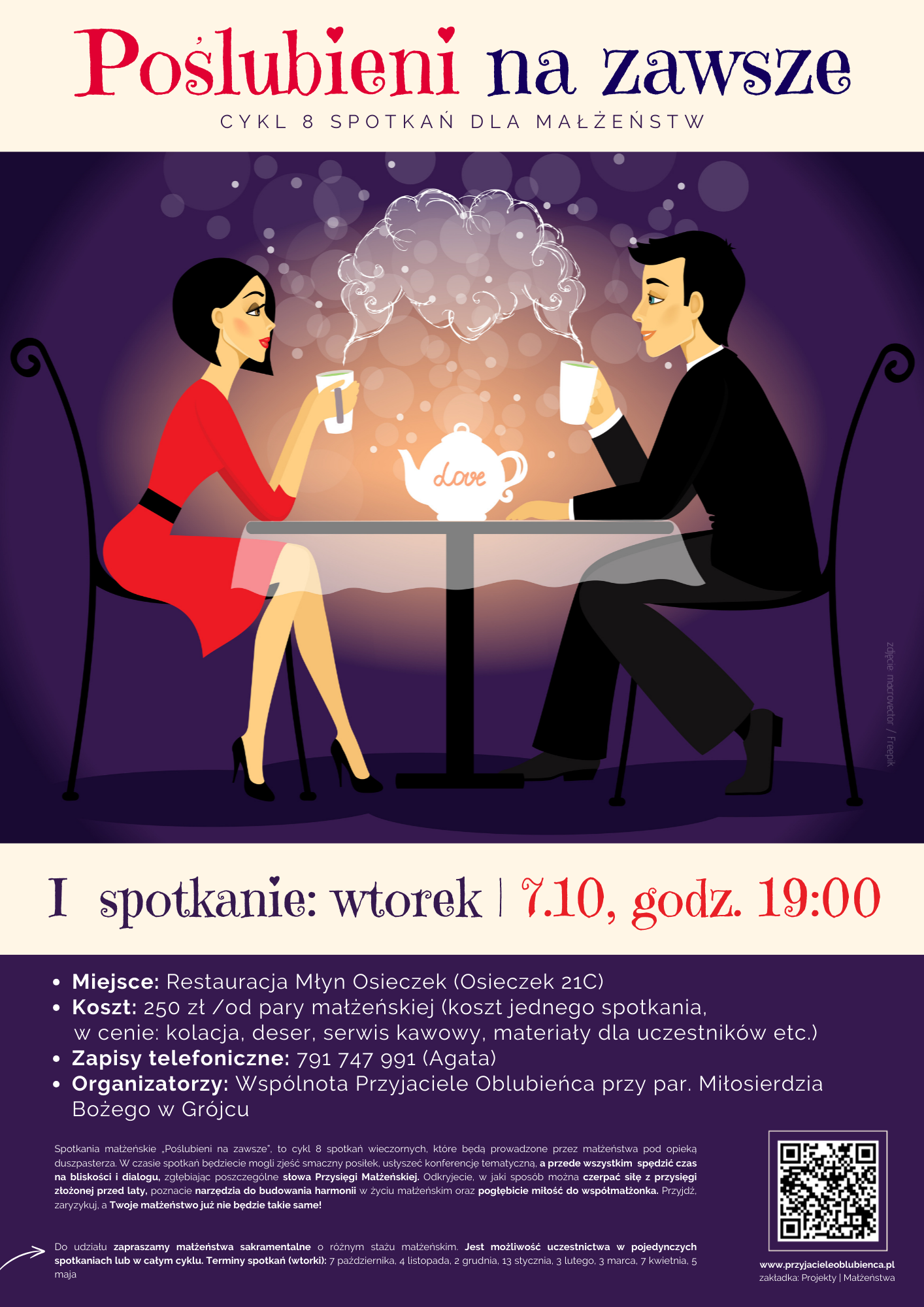 Podczas tych spotkań uczestnicy będą zgłębiać poszczególne słowa Przysięgi Małżeńskiej. Odkryją, w jaki sposób mogą czerpać siłę z przysięgi złożonej przed laty. Poznają narzędzia do budowania harmonii w życiu małżeńskim. Do udziału zapraszamy małżeństwa o różnym stażu małżeńskim.