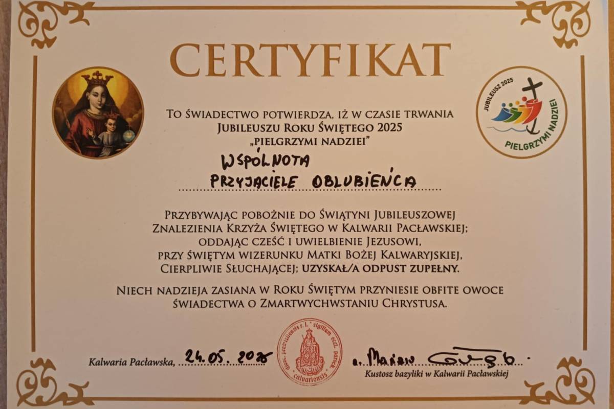 24 maja 2025 r. Przyjaciele Oblubieńca z Lublina z kościoła Ducha Świętego wybrali się na pielgrzymkę do Kalwarii Pacławskiej. Podróż upływała szybko przy modlitwie i śpiewie wzbogaconym akompaniamentem gitarowym ks. Andrzej Oleszko. Na miejscu wspólnie przeżyta Msza Święta - odprawiona między innymi w intencji naszej wspólnoty. Święty Wenanty Katarzyniec przyjął intencje i wysłuchał modlitw. Panu Bogu niech będą dzięki!